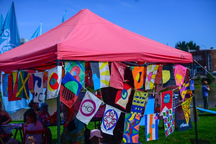 For LAND 2022 workshops were held in Dumfries, Kirkcudbright and Annan. The flags flew along the suspension bridge in Dumfries at Nithraid River Festival in Dumfries and were paraded around Annan before being hoisted onto the tall ship La Malouine. They flew in Kirckudbright’s Moat Brae and onboard The Lady of Avenel tall ship at The Findhorn Bay Arts Festival in Buckie.