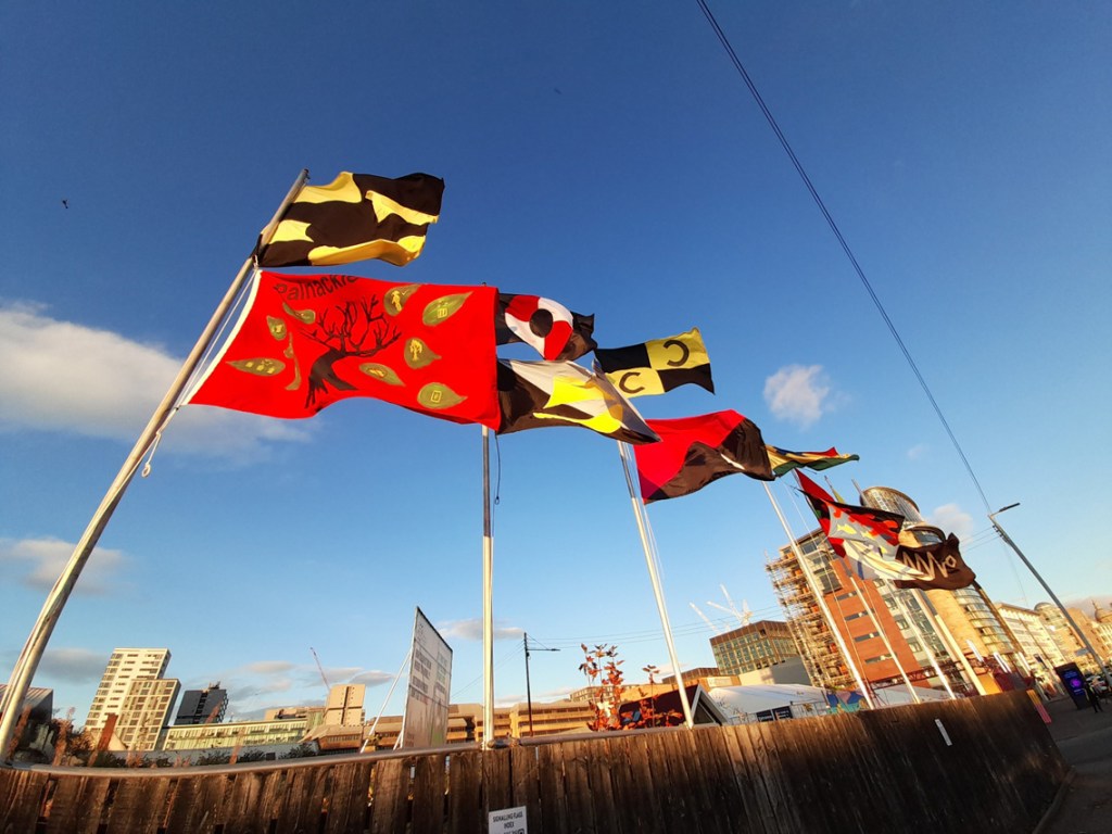 Below: Flags flying at COP26 from 1-12 Nov 2021 at The Landing Hub, Broomielaw. http://www.thesustainableglasgowlanding.com/events