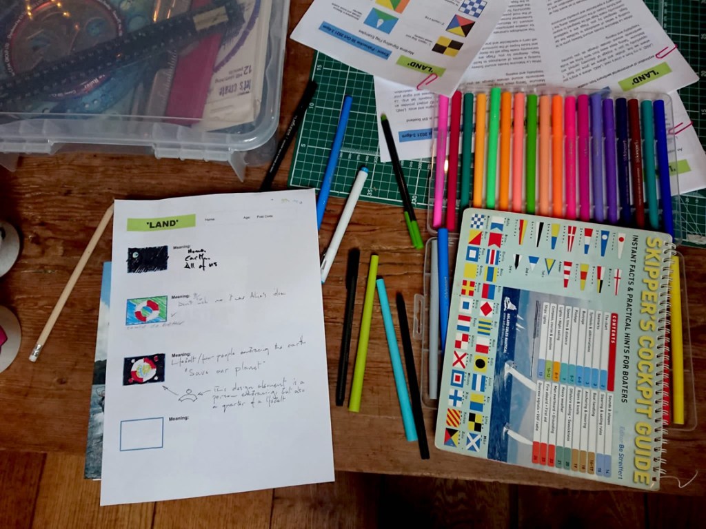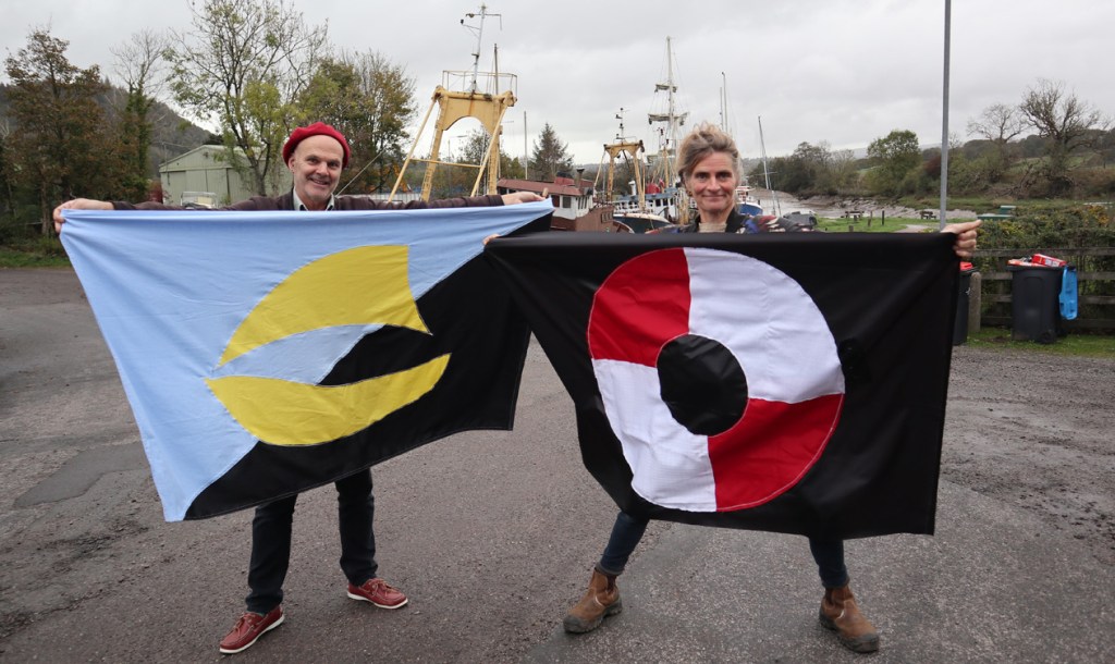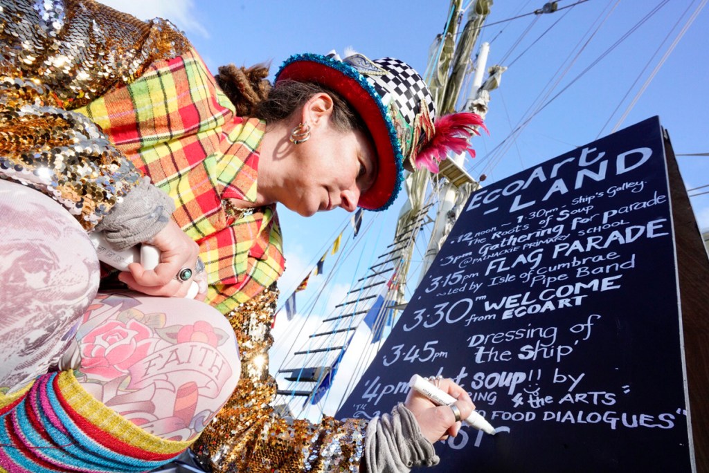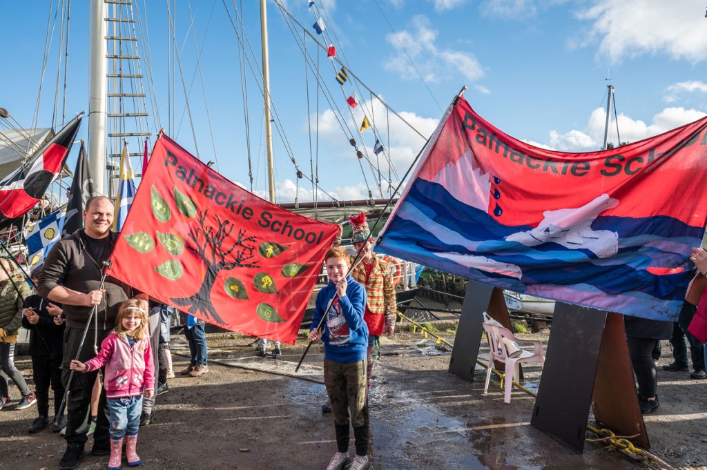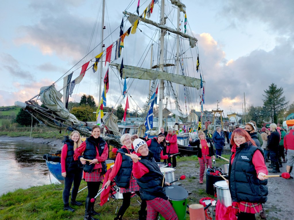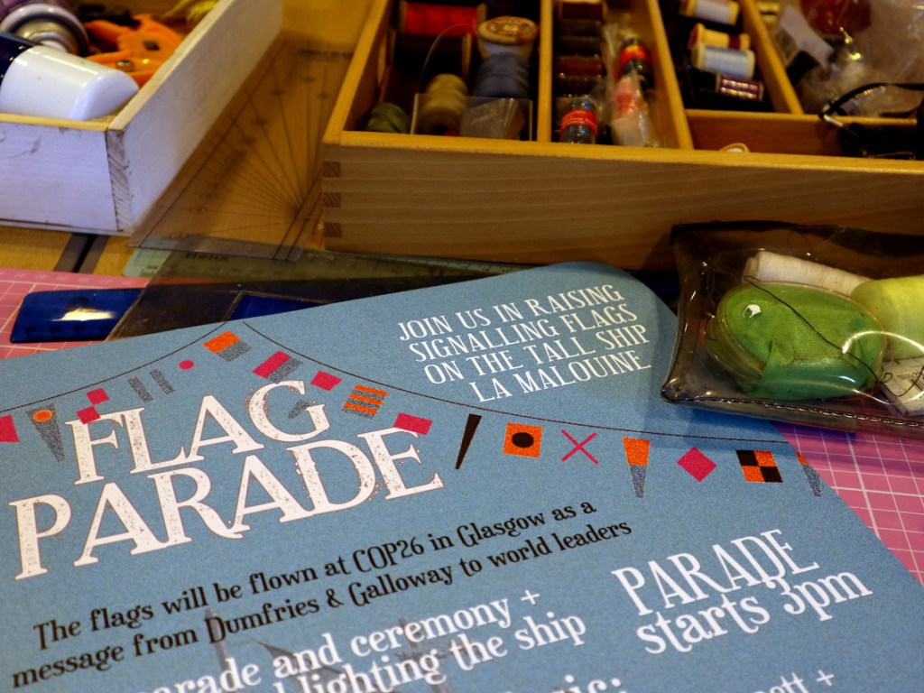 A journey of discovery and celebration. Local artists hosted a series of workshops for communities to design and make novel maritime flags. Flags are a traditional way of signalling at sea and these community made flags from upcycled fabric were designed to express and signal environmental concerns and future hopes. The event day was at Palnackie October 20th 2021, where hundreds of people gathered for a ‘Dressing of the Ship’ celebration where the flags were hoisted into the ship’s rigging, along with a spectacular procession, food and art event and live music on the quayside. When flown all together on the tall ship, the flags carried a spectacular and powerful environmental message. The flags then headed off to Glasgow to be flown at COP26 from 1-12 Nov 2021, taking messages from Dumfries and Galloway to world leaders.