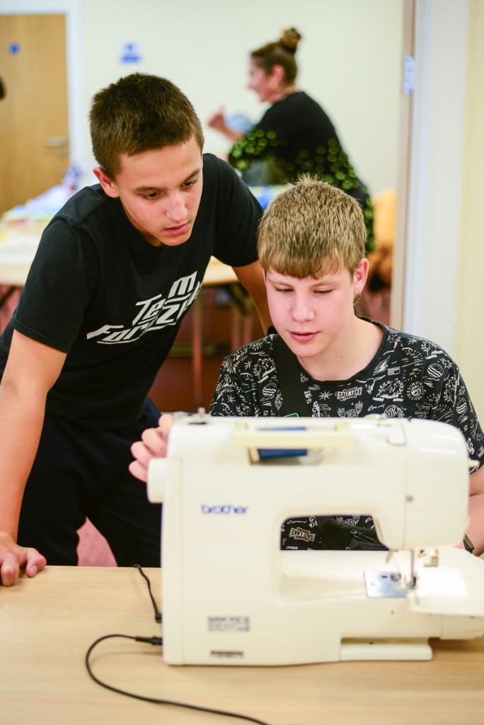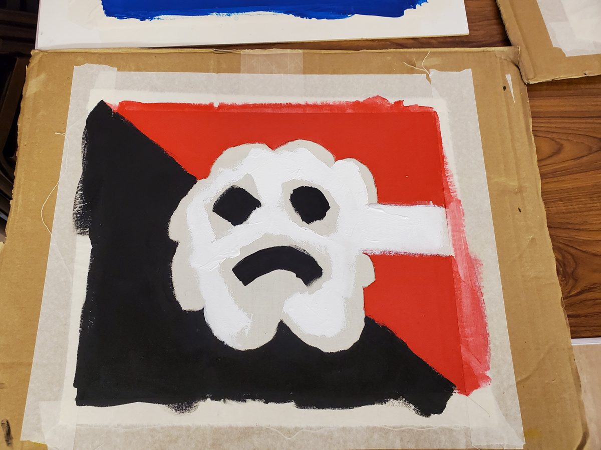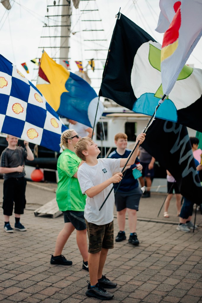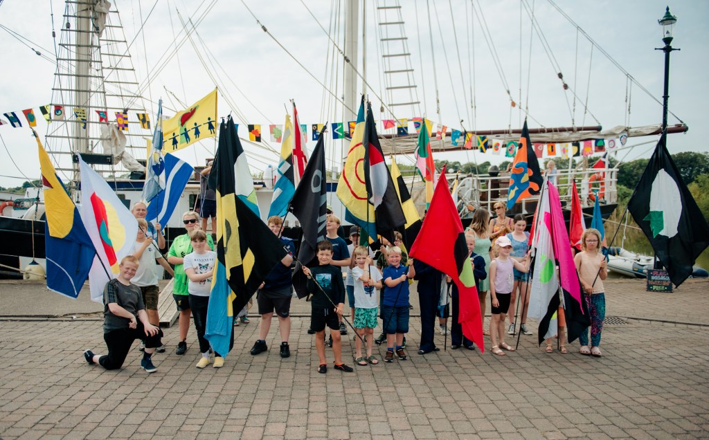Below: Community and youth flag design and making workshops in Buckie, Moray. Flag flying on Tall ship Lady of Avenel