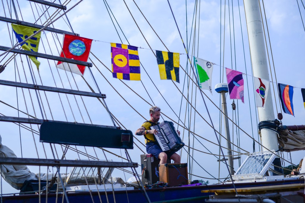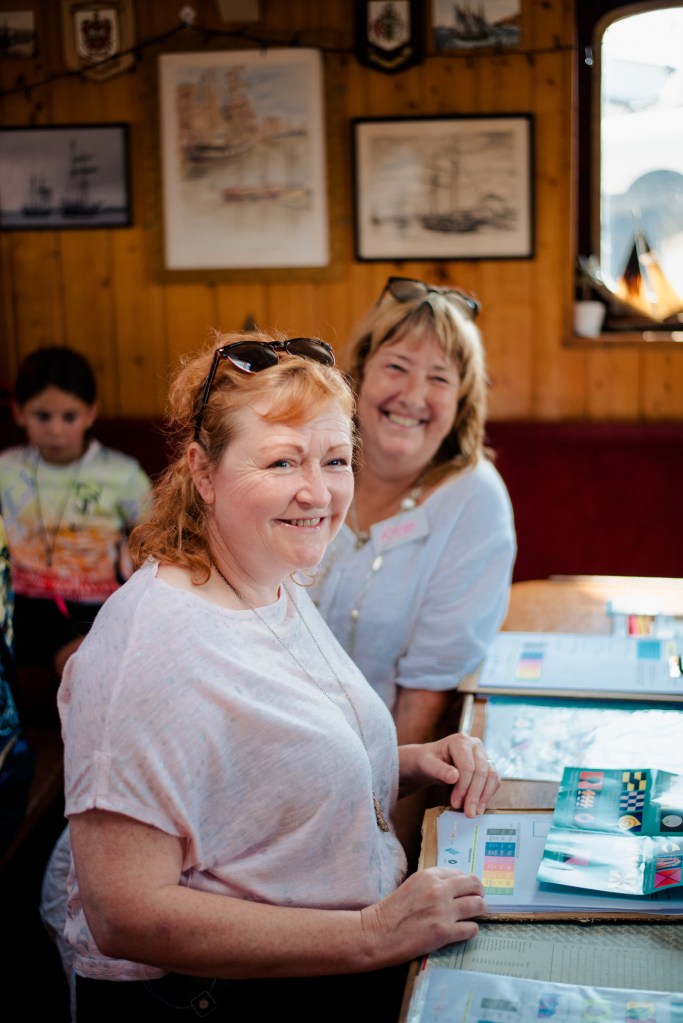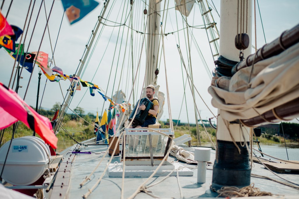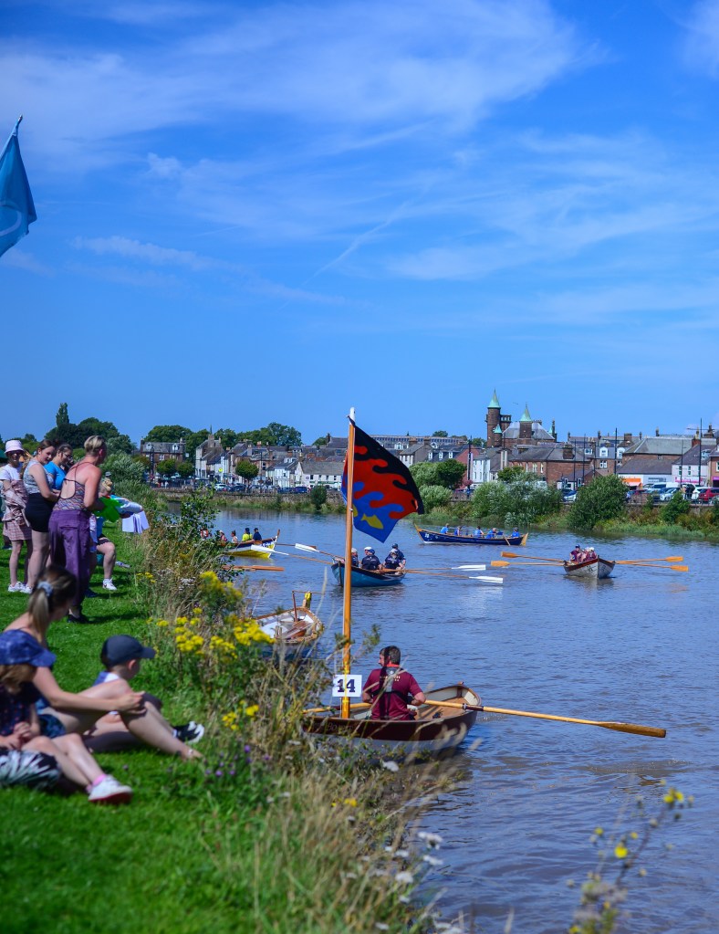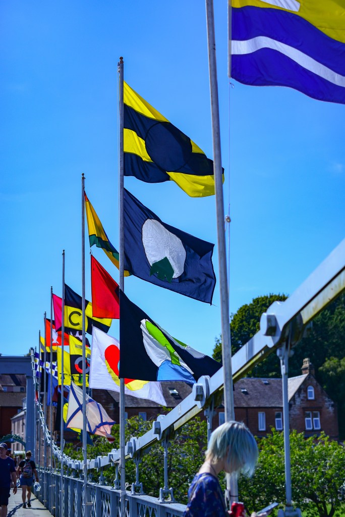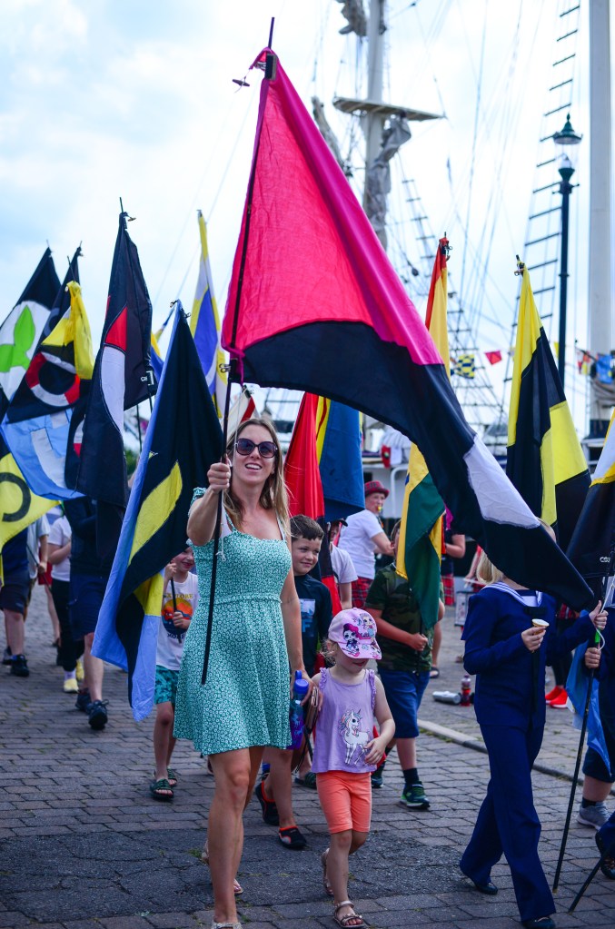 For Nithraid in Dumfries, all the participating boats in carried a flag and as they arrived in Dumfries they were carried to and flown on the suspension bridge. At the Bell Raid in Annan, flag design and make workshops were held aboard tall ship La Malouine and a procession through the town was held with music from The Samba Sisters before the flags were hosted up the rigging.